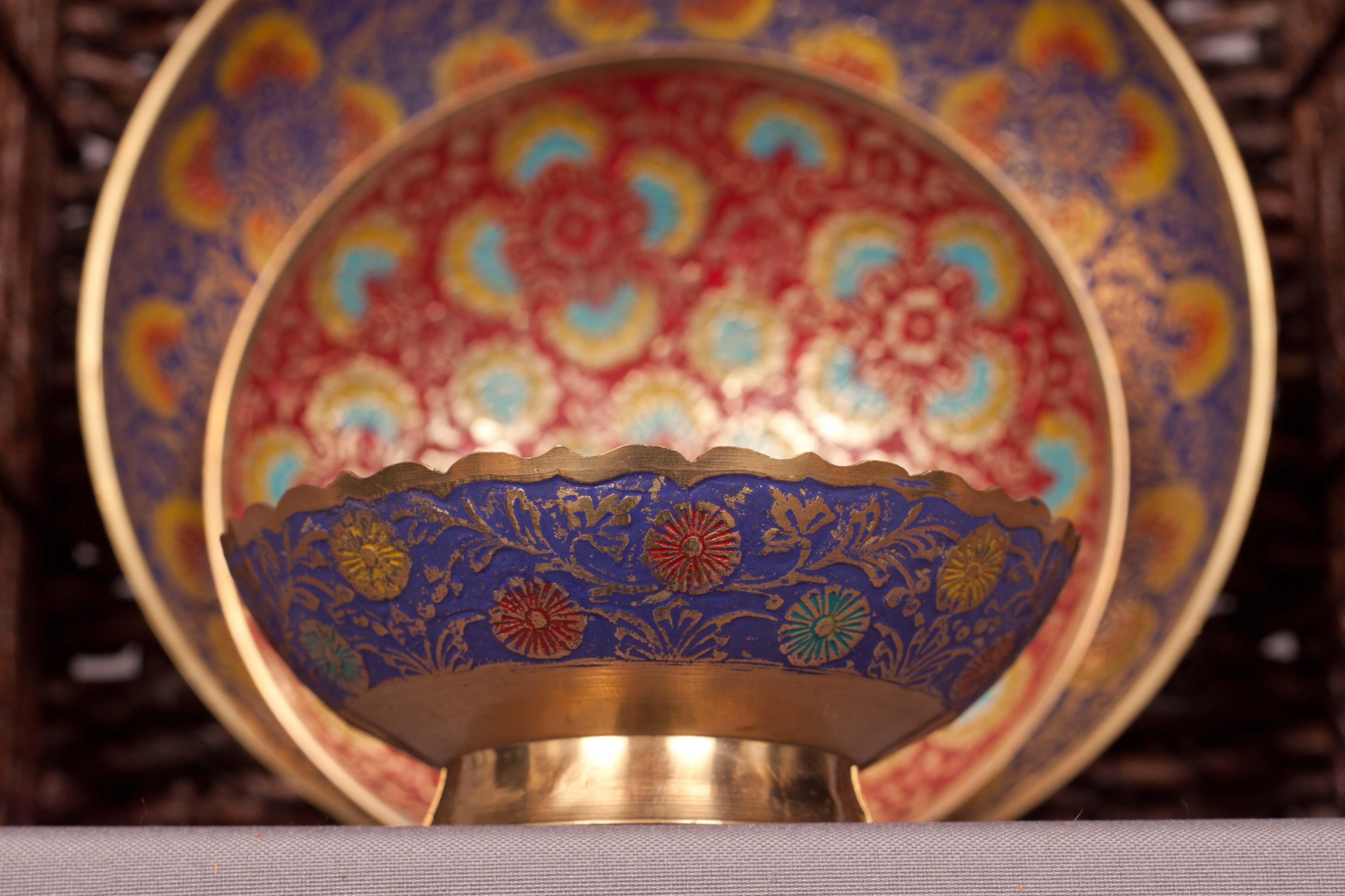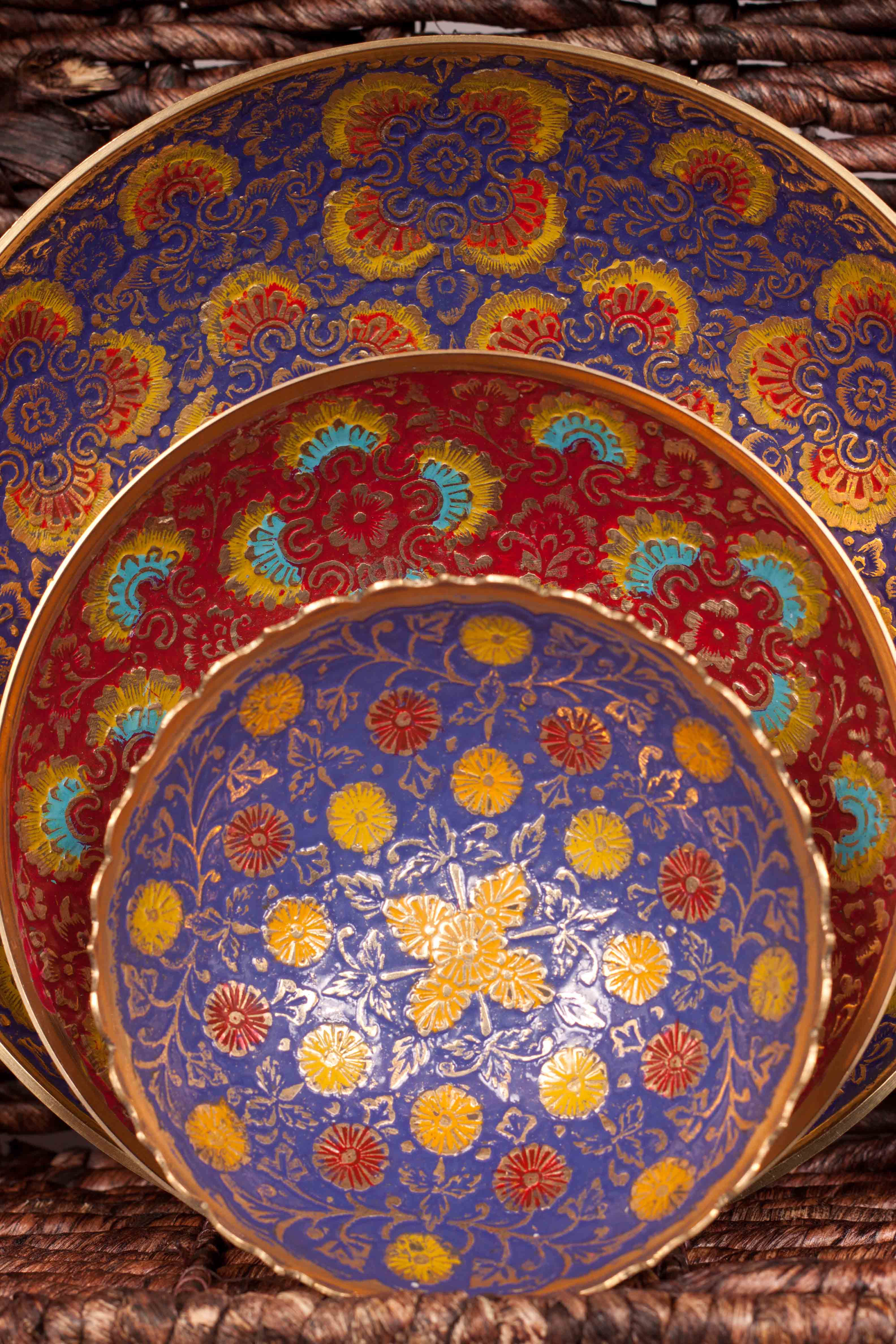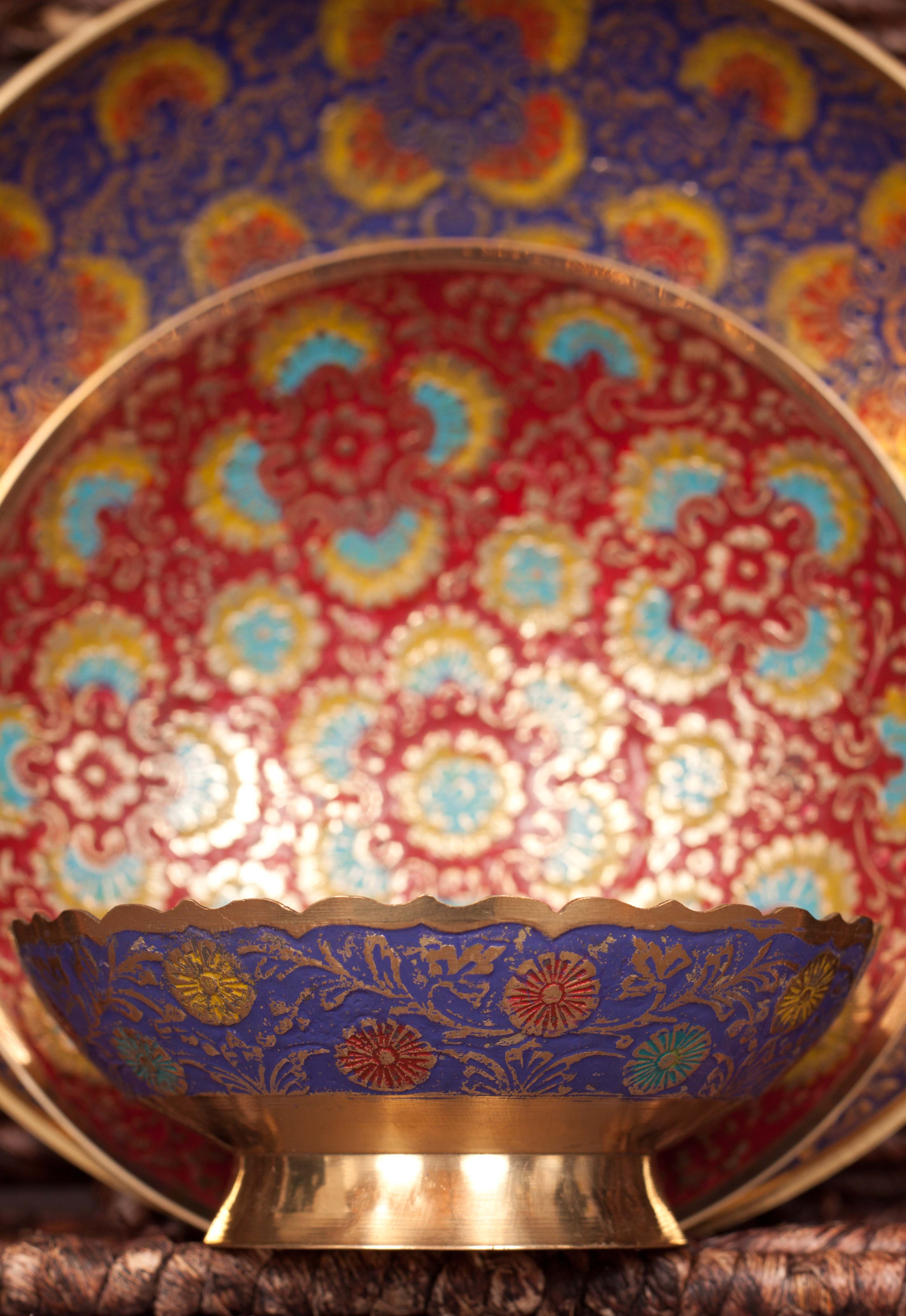 These beautiful brass bowls are stamped brass, handpainted with enamel in India. They are full of intricate details, and would be a stunning addition to your wall, bookshelf, coffee table, or to be used as a wrapped candy bowls. There is only ONE set available, so you'll be sure to have an exclusive piece of home décor that all your friends will envy!