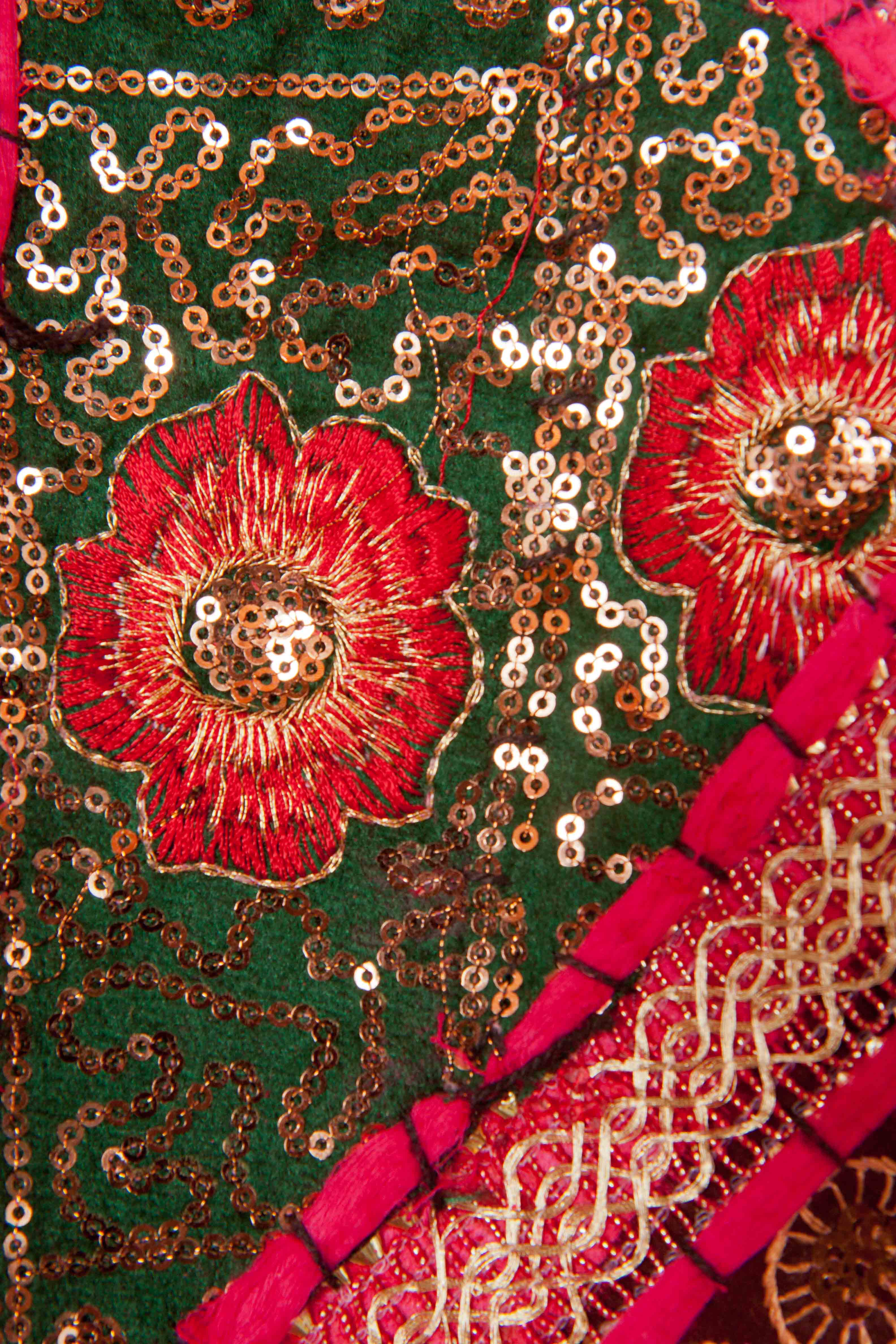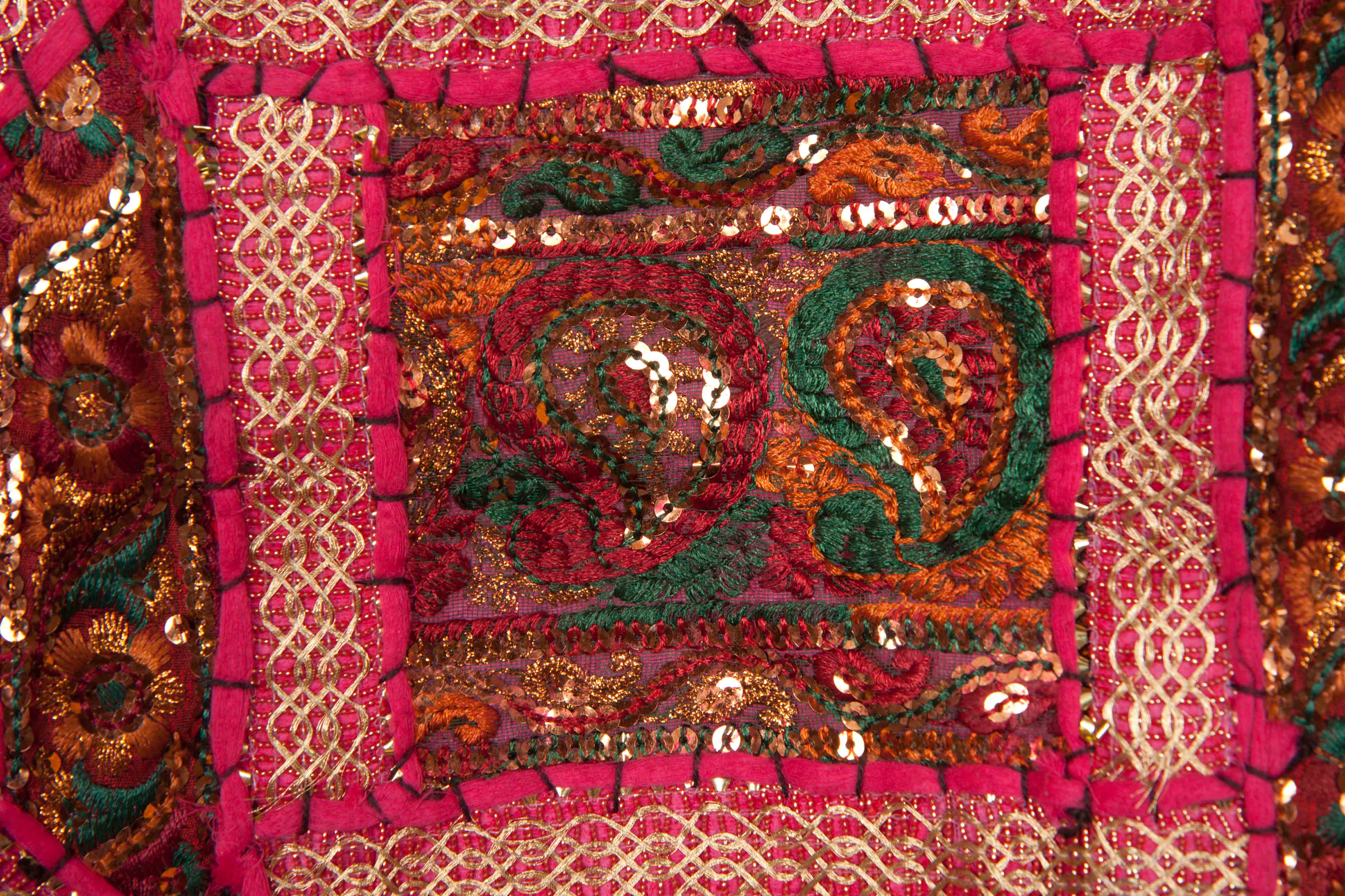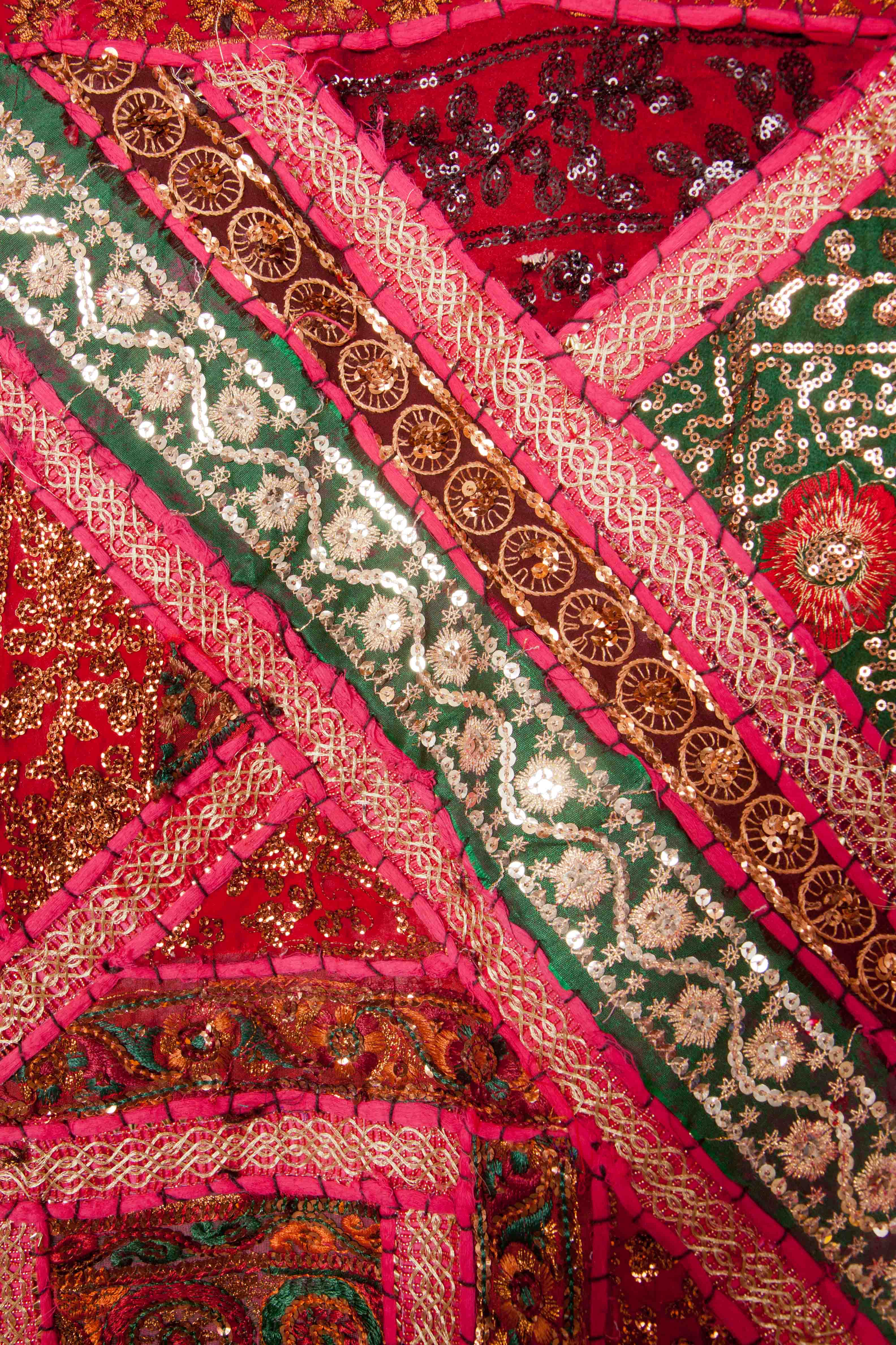 This elaborate, one of a kind tapestry was handmade by an artisan in India. The rich pinks, greens, gold, and copper embellishments of this piece will bring a beautiful pop of color to your home as a wall hanging, table cover, or decorative throw for your couch. Any way you display it, it will become an instant conversation piece!