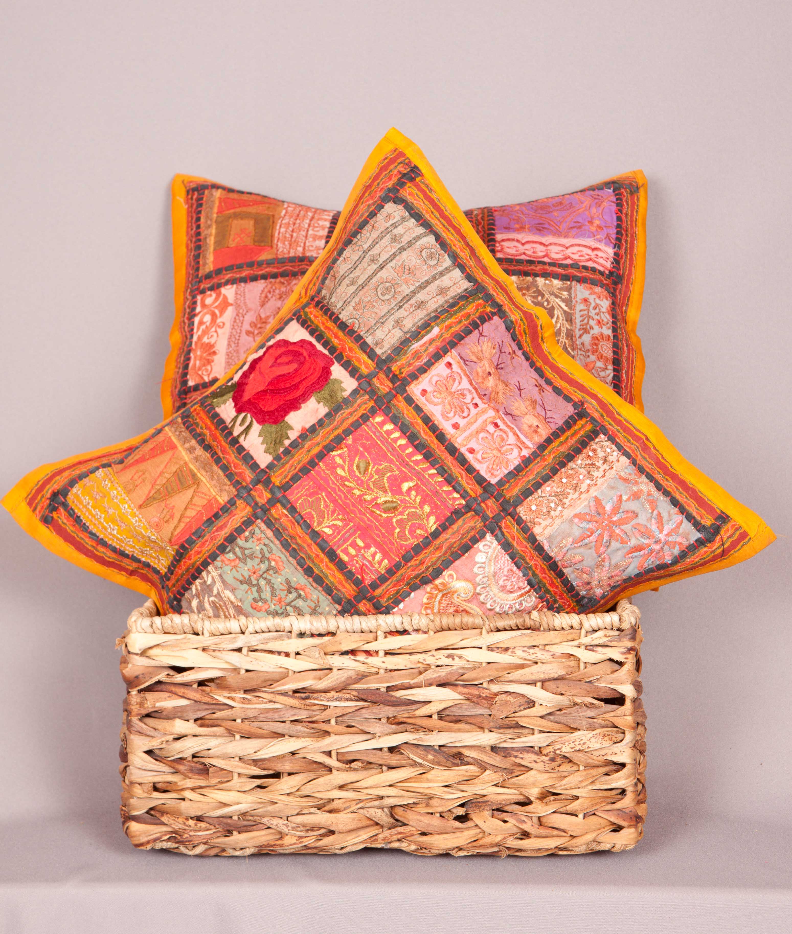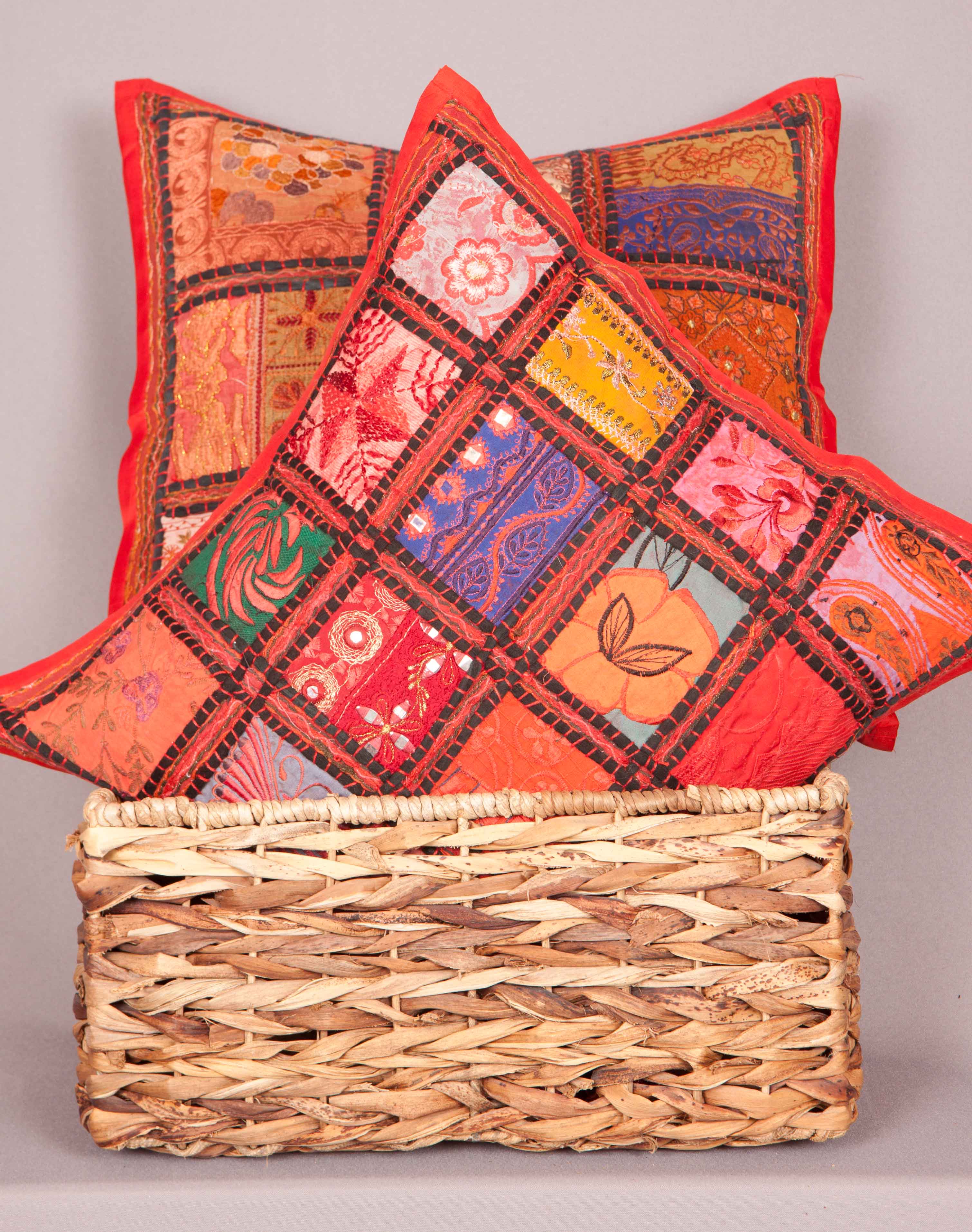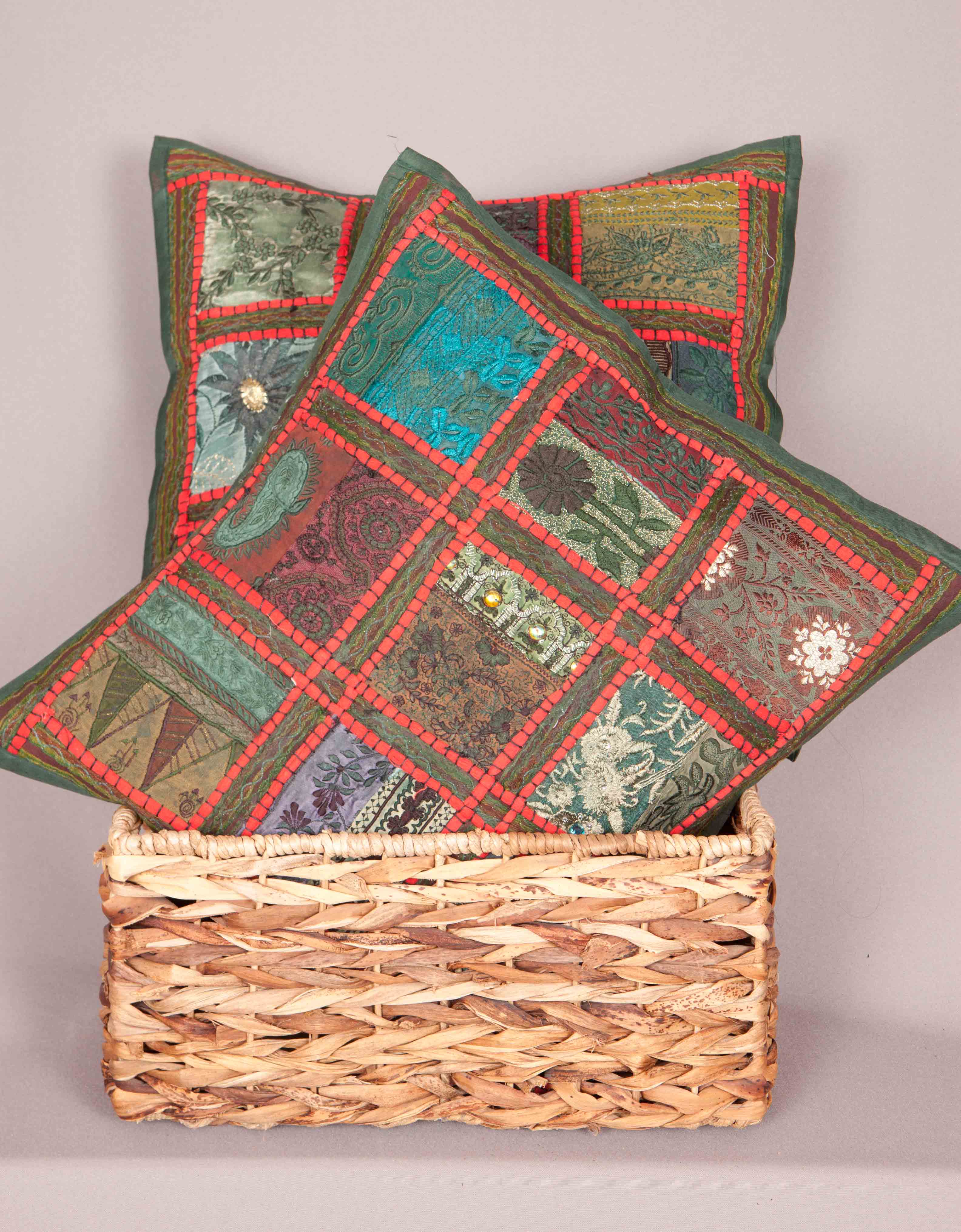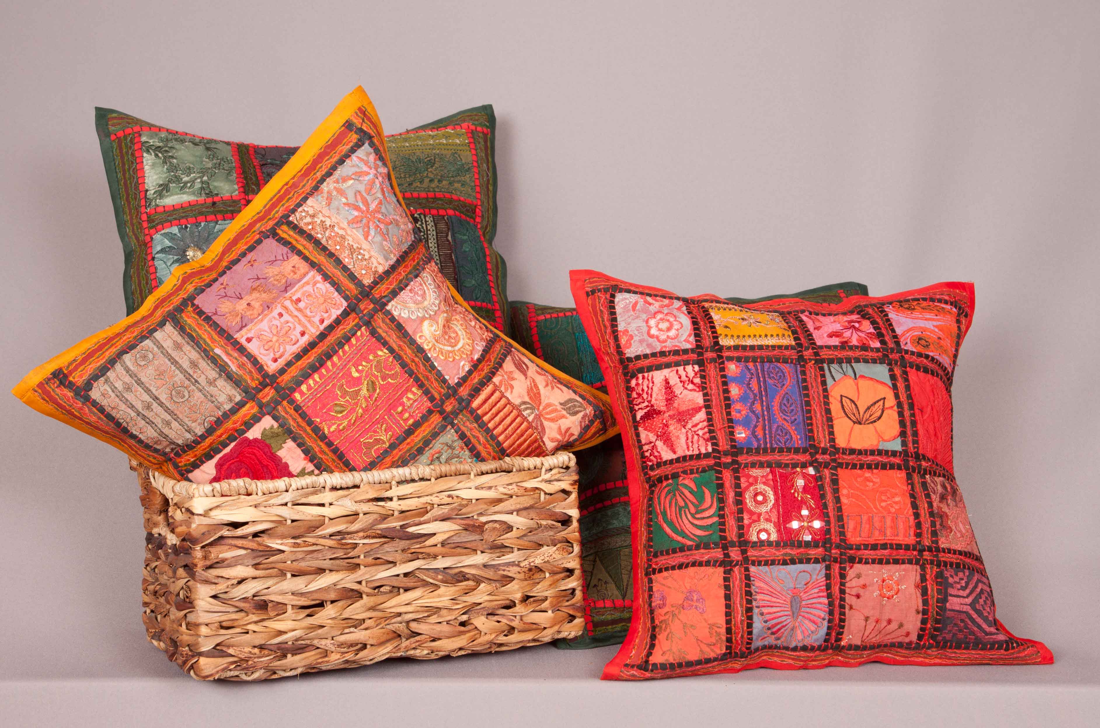 These beautiful patchwork pillow covers are handmade by women in India. Each individual "patch" gives a piece of fabric that might have been a sari or scarf, new life!