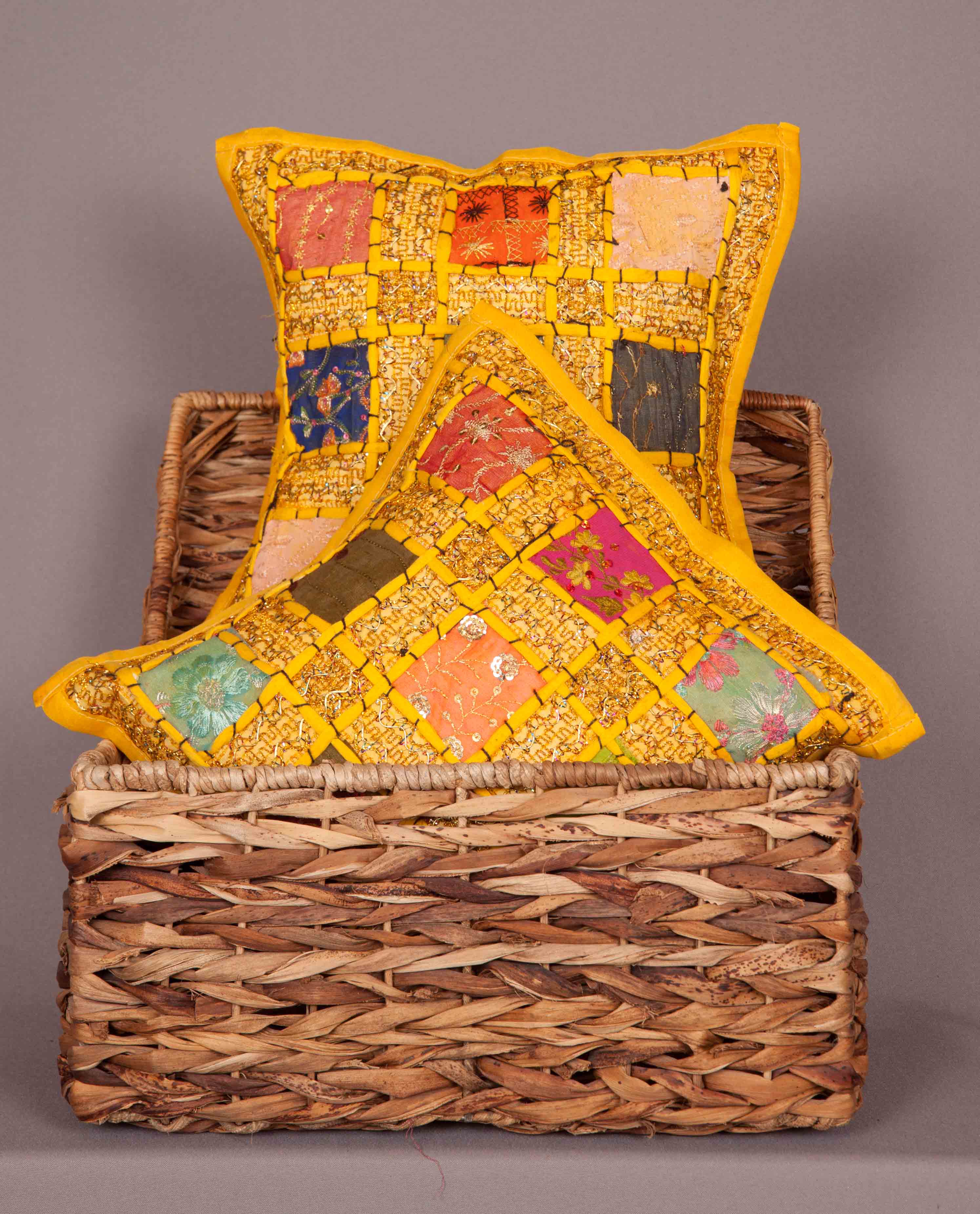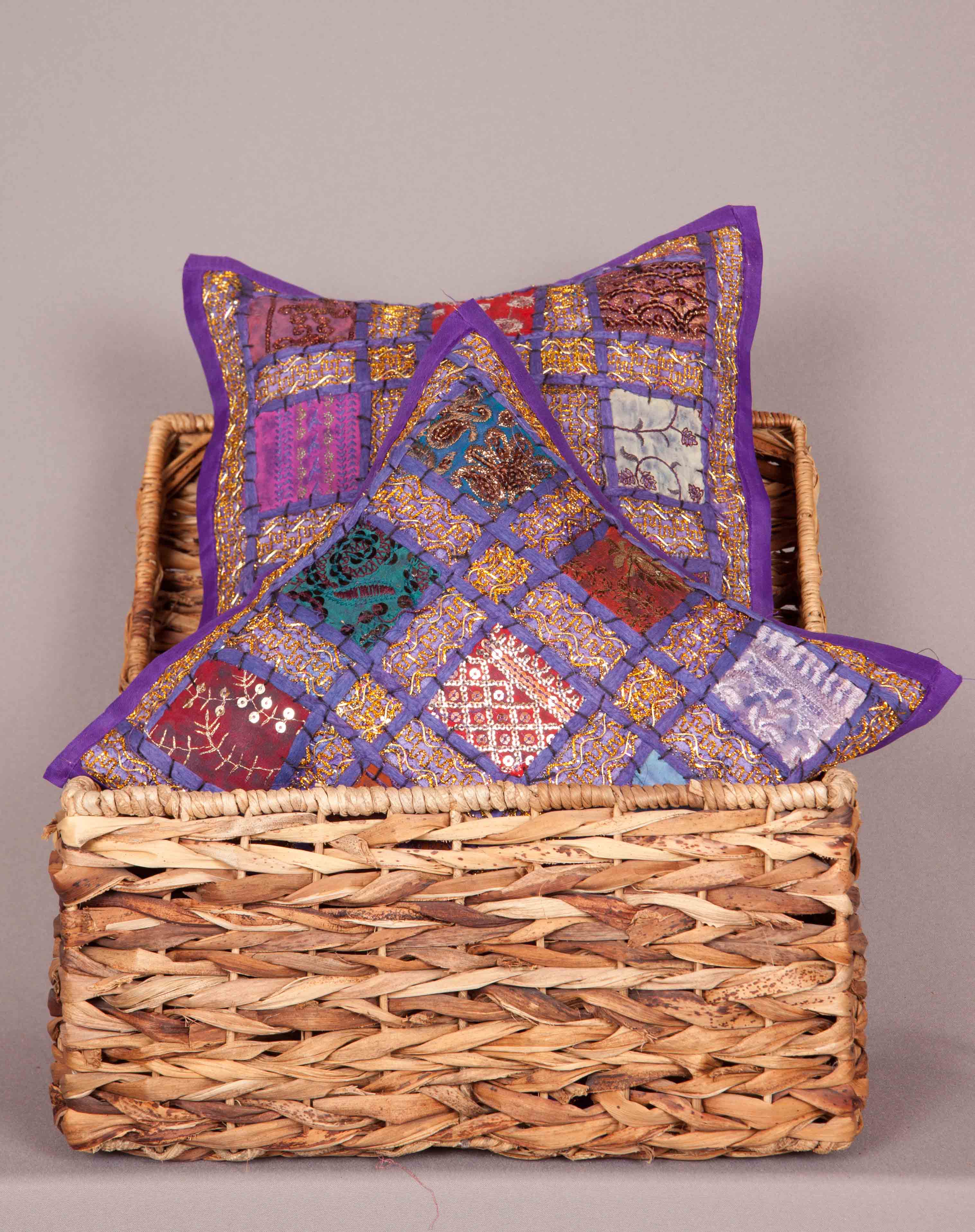 These beautiful patchwork pillow covers are handmade by women in India. Each individual "patch" gives a piece of fabric that might have been a sari or scarf, new life!